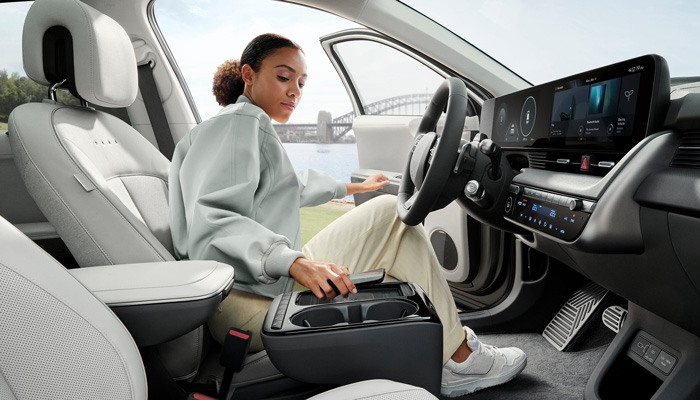 IONIQ 5 получил новую центральную консоль с кнопками (подогрев/вентиляция сидений, подогрев рулевого колеса, парковочные камеры), подстаканниками и беспроводным зарядным устройством для смартфона. Приборная панель и сенсорный экран имеют черную рамку вместо прежней белой.