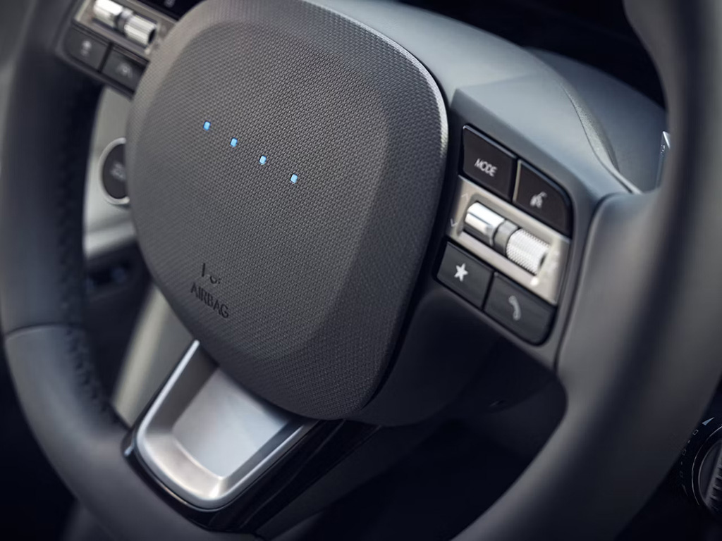 Четыре пиксельных светодиода на рулевом колесе приветствуют водителя в автомобиле и взаимодействуют с ним, отображая режим движения и сигнализируя о состоянии систем автомобиля, таких как уровень заряда батареи.